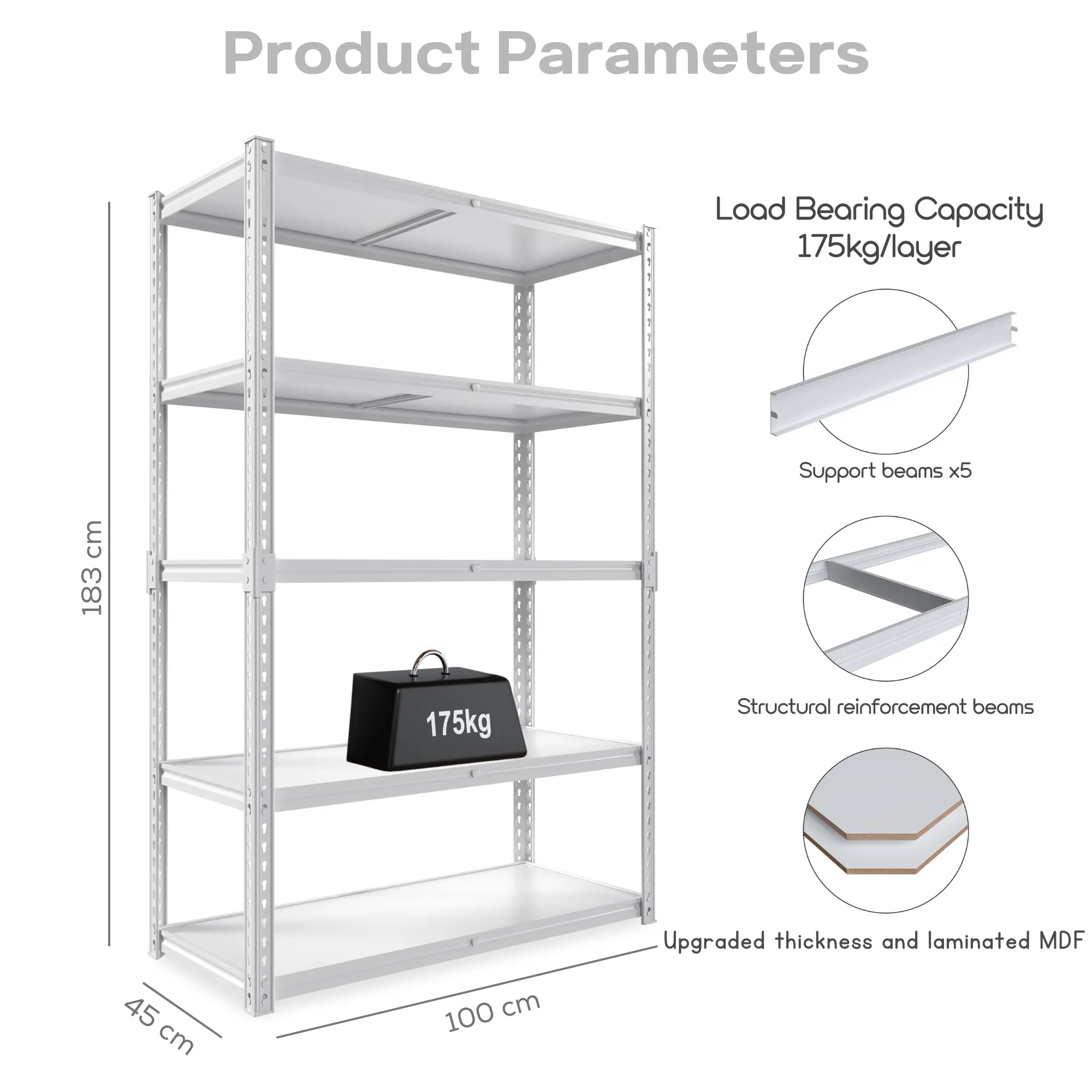 5-Tier Shelf(183x100x45cm, 175kg/Layer) White Steel Frames With White Laminated MDF Board – Versatile for Home, Garage, Office, Shop & Warehouse